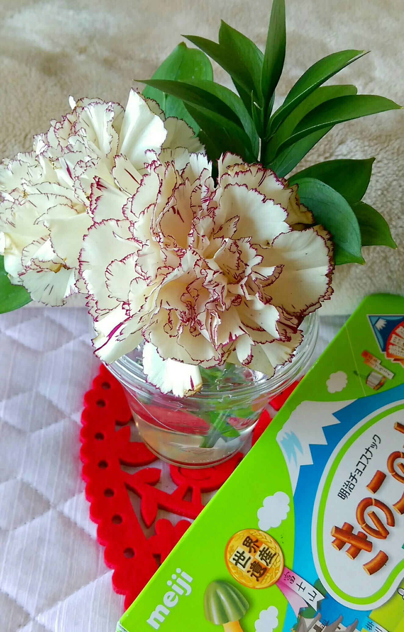葉っぱと、カーネーションが、もっています。